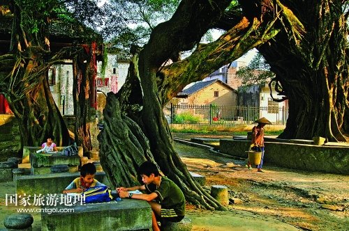 其四,鏡頭也能說故事,圖片里面有人文。呂建偉并沒有把古榕、古建筑當作無生命的標本來拍攝,而是用鏡頭來記錄那方水土中人們的生存環(huán)境、生活內容和精神風貌,讓平面的圖片凸顯出豐富的、具有特色的人文元素來。從圖片的標題《冬陽遍灑暖人間》、《古榕塘畔好“擺古”》、《憶往昔舊事歷歷味更濃》、《看今朝雛燕展翅欲高飛》中,就能看出作者“以攝影圖片說人文”的理念。