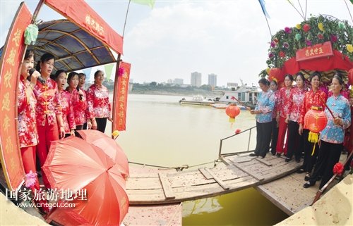 國(guó)家旅游地理 廣西南寧10月3日訊(記者 龍博 實(shí)習(xí)生 雷麗軍/文 記者 段柳健/圖) 金秋十月的邕江河畔,秋高氣爽,碧水粼粼。昨日,從南寧港的江邊傳來陣陣漁歌與歡喜的嗩吶聲,原來,水上人家周木蘭家在這一天嫁女,一場(chǎng)古樸而傳統(tǒng)的水上婚禮儀式正在邕江岸邊拉開序幕。隨著水上人家的上岸,這樣的傳統(tǒng)婚俗儀式越來越少見,而獨(dú)特且略顯神秘的婚俗也吸引了四面八方過來湊熱鬧的人們。