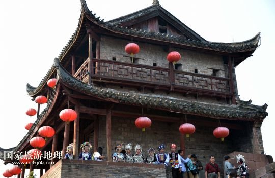 10月13日,來(lái)自湖南靖州苗族侗族自治縣的展演隊(duì)伍在鳳凰古城城樓上展示苗服。