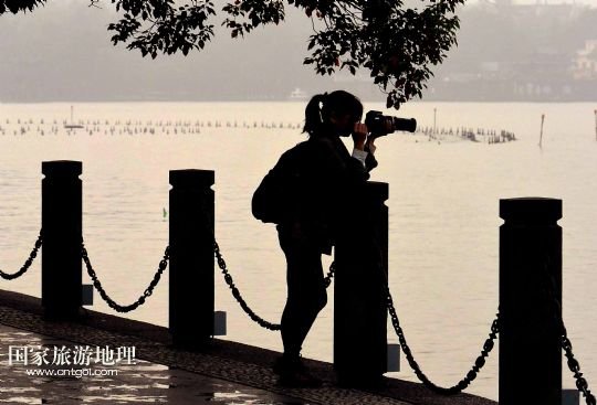 國(guó)家旅游地理 浙江杭州11月5日訊 11月4日,一對(duì)男女青年在西湖邊拍照留影。生活在杭州的人是幸福的,因?yàn)楹贾萦形骱?。清晨的西湖,恬靜,淡雅,柔美,朦朧。岸邊,堤上,健身鍛煉的市民、散步賞景的游人,在湖水、小橋、亭閣、石欄的襯伴下,構(gòu)成了一幅幅剪影效果的水墨圖畫。 /新華社記者王頌攝