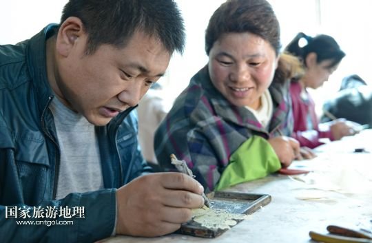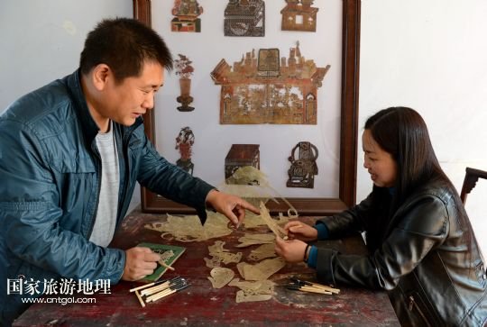 國家旅游地理 河北唐山4月2日訊 郭寶在檢查一件皮影藝術品的雕刻質量(3月30日攝)。河北省遷安市趙店子鎮(zhèn)馬古寺村村民郭寶自幼喜歡皮影雕刻,師承當?shù)氐窨趟嚾送跽淅舷壬?,他雕刻的影人造型古樸、工藝精細,深受皮影收藏愛好者的歡迎。2003年,郭寶成立了“郭寶皮影傳承工作室”,并從村里招來20多位喜歡皮影藝術的農(nóng)民專門從事皮影雕刻。經(jīng)過幾年的發(fā)展,如今郭寶皮影工作室開發(fā)設計皮影工藝品3000余種,在傳承保護唐山皮影的同時還獲得了豐厚的收入。 /新華社記者楊世堯攝