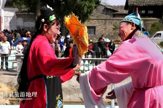 4月28日,江西省靖安縣中源鄉(xiāng)農(nóng)民劇團(tuán)的農(nóng)民為游客表演地方戲。