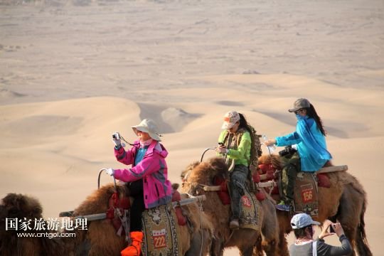 甘肅敦煌:中外游客騎游鳴沙月泉景區(qū)(圖)
