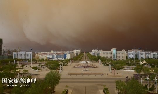 國家旅游地理 甘肅玉門5月23日訊 5月23日,在甘肅玉門市,突如其來的沙塵籠罩了整個(gè)城市。當(dāng)日上午,受新疆低槽冷空氣的影響,甘肅玉門境內(nèi)天空出現(xiàn)罕見的云層奇景和沙塵天氣,原本非常晴朗的藍(lán)天,霎時(shí)天昏地暗,同時(shí)伴有6至7級(jí)西風(fēng),能見度只有500米。新華社發(fā)(楊旭升 宋常青 攝)