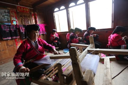6月29日,在廣西桂林龍勝各族自治縣泗水鄉(xiāng)潘內(nèi)瑤寨,紅瑤婦女在“紅衣節(jié)”上織布。