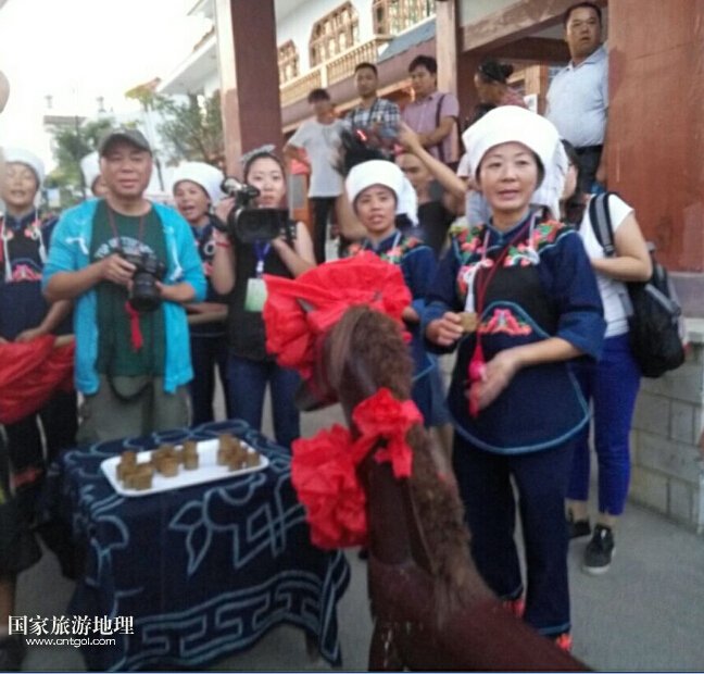 這是黔南惠水縣好花紅布依風情寨,為了歡迎遠方客人的到來,布依族人在寨門前擺滿酒杯唱起山歌。在進寨前客人都要喝三杯攔門酒,喝完才能進入寨中。同時,布依族習(xí)俗中,遠方客人到來,坐上木馬,喝完三杯米酒也寓意著會交好運。